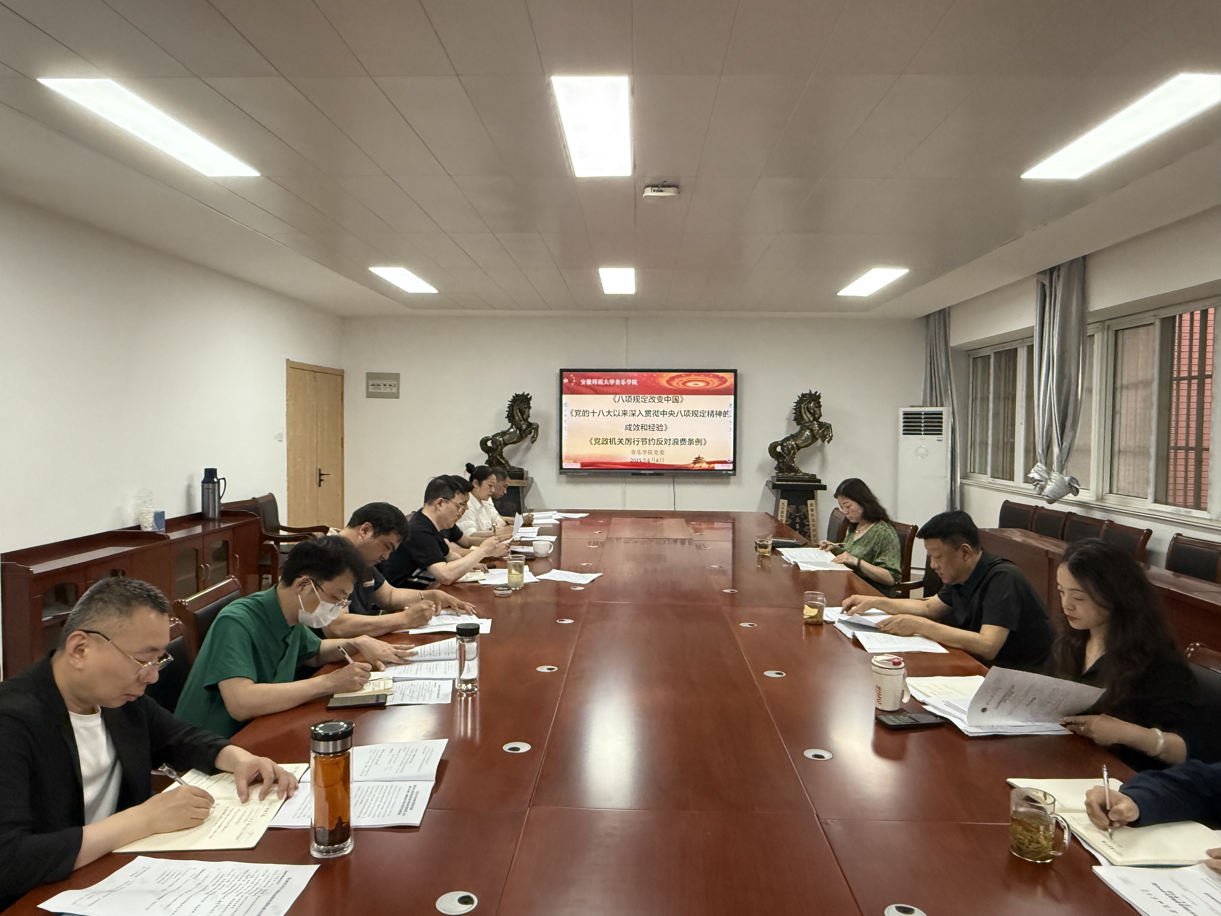 会议集中开展了警示教育,传达学习中央层面深入贯彻中央八项规定精神学习教育工作专班、中央纪委办公厅关于2起党员干部在学习教育期间违规吃喝、严重违反中央八项规定精神典型问题的通报,以及省委常委会相关会议精神。学院党委副书记、纪委书记王俊荣领学了《党政机关厉行节约反对浪费条例》。