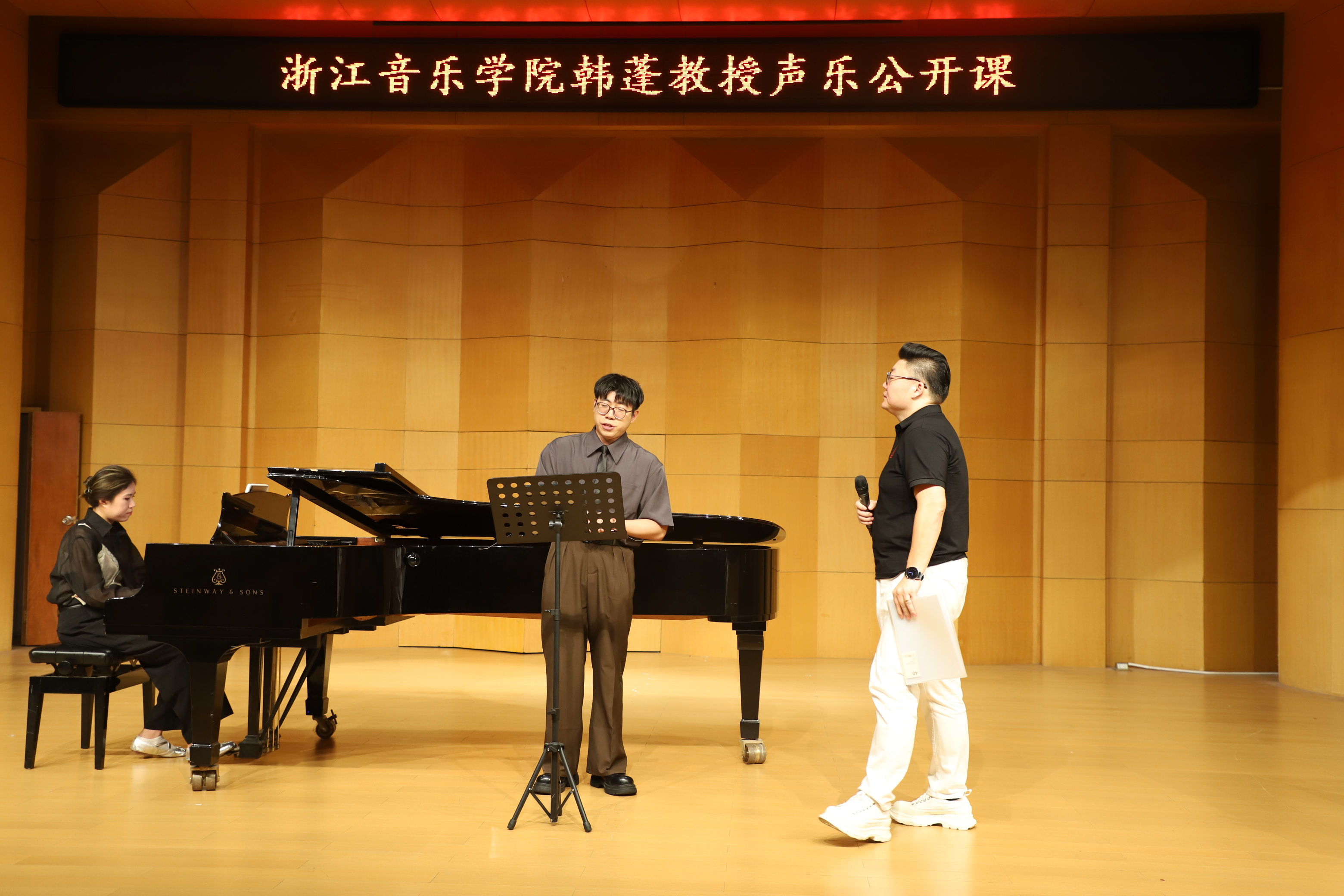(本网讯 文/郭宇 图/许恺霖)10月9日,著名男高音歌唱家,浙江音乐学院声歌系副主任、教授、一级演员、硕士生导师韩蓬教授莅临我院举办声乐专家课,本次活动吸引众多教师、学生前来观摩学习,现场座无虚席,学习氛围浓厚。