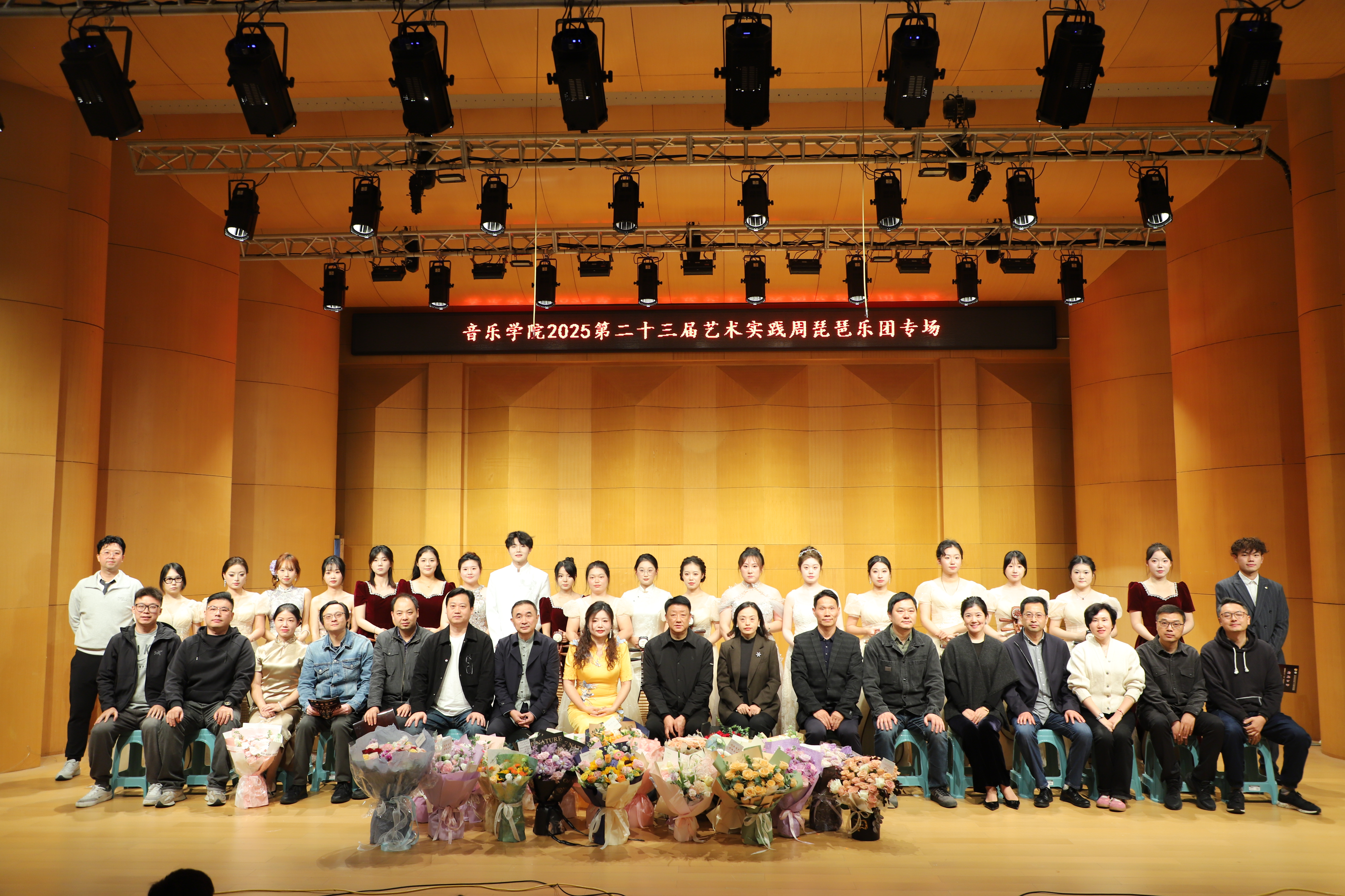 张迎春、李春犁携手演绎琵琶协奏《云想花想》,二者琴瑟和鸣,仿佛与听众一齐见证牡丹绽放的倾城之美,将音乐会氛围推向高潮。全体师生共同演奏的《十面埋伏》与《我和我的祖国》,以磅礴气势与深情旋律收尾,赢得全场掌声。