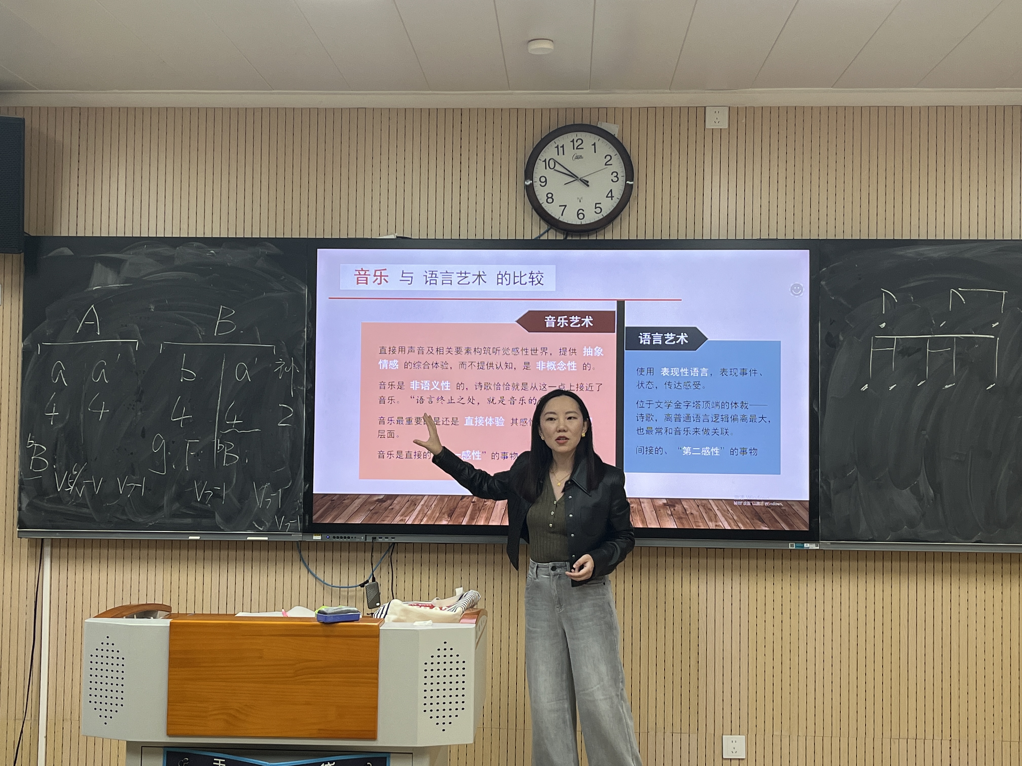 李露莎所授课程为《音乐美学基础》第三章“音乐的存在方式”。她从“为何探讨音乐存在方式”切入,厘清“音乐不等于音响”“音乐不等于作品”的认知误区。在物质性存在维度,解析乐谱的符号局限与表演文本的动态转化作用;精神性存在维度,从创作构思、审美理想及个体审美感受、审美记忆等方面结合具体案例,揭示了音乐的精神本质;最后阐明主体与客体、精神与物质的统一性,强调音乐意义在主客体感性交流中生成。