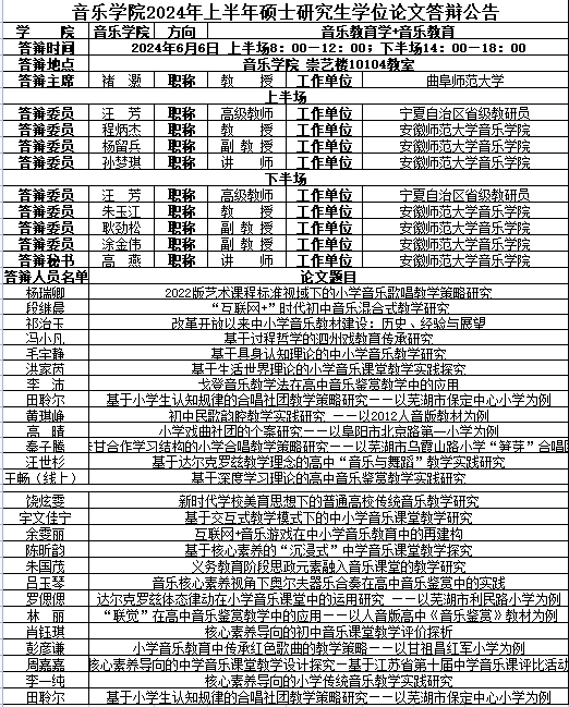 音乐学院2024年上半年硕士研究生学位论文答辩公告