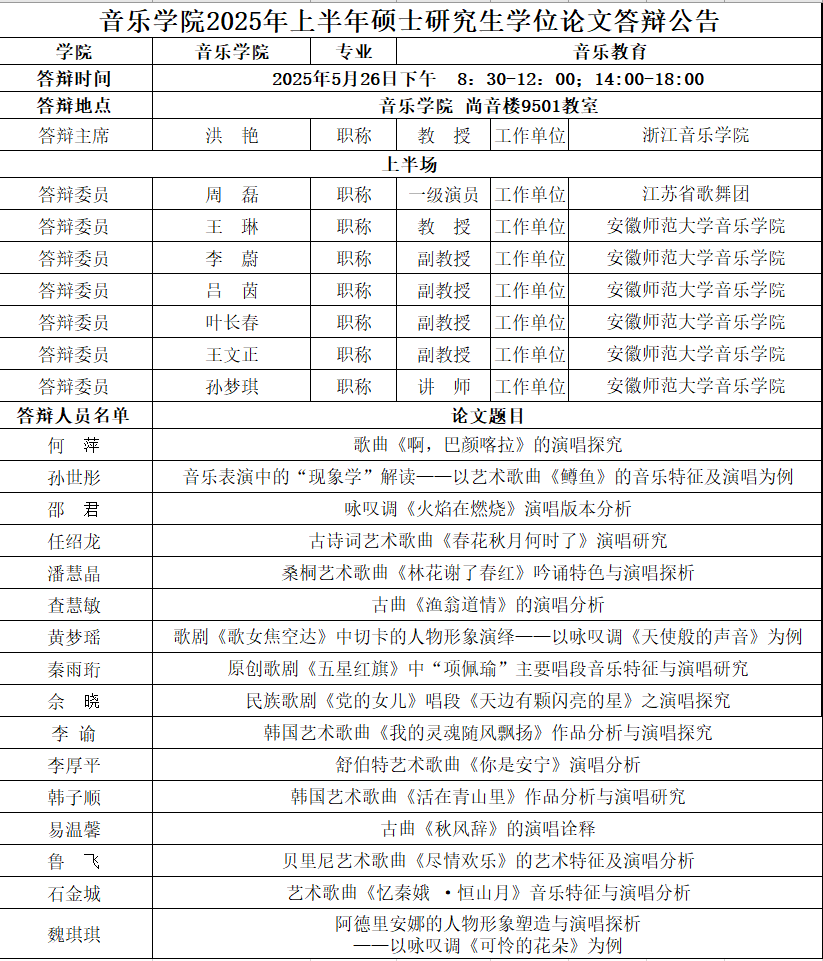 音乐学院2025年上半年硕士研究生学位论文答辩公告
