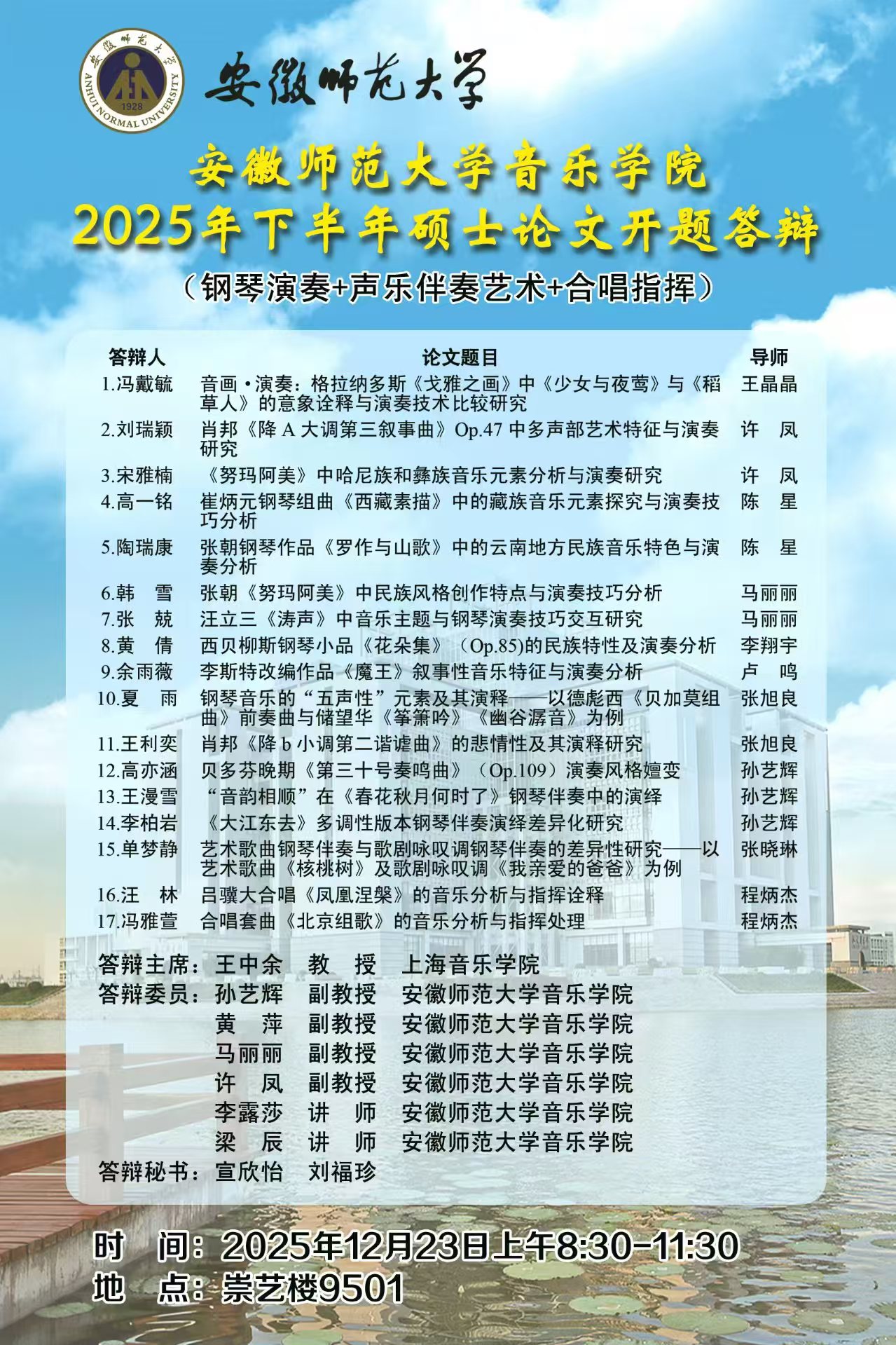 安徽师范大学音乐学院2025年下半年硕士论文开题答辩(钢琴演奏+声乐艺术伴奏+合唱指挥)