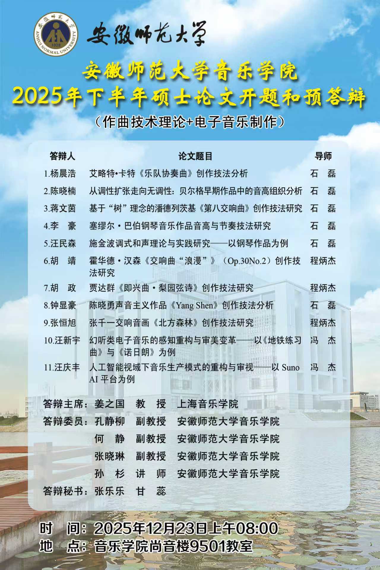 安徽师范大学音乐学院2025年下半年硕士论文开题和预答辩(作曲技术理论+电子音乐制作)
