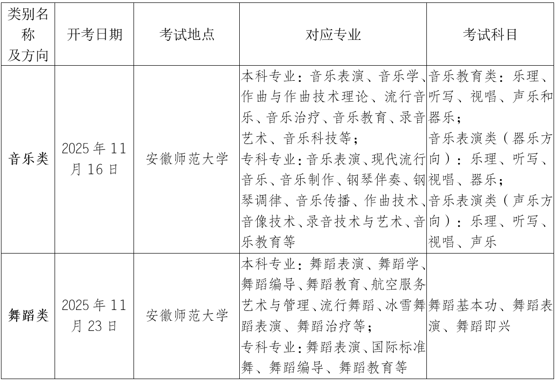 安徽省2026年普通高校招生艺术类专业省统考基本情况一览表
