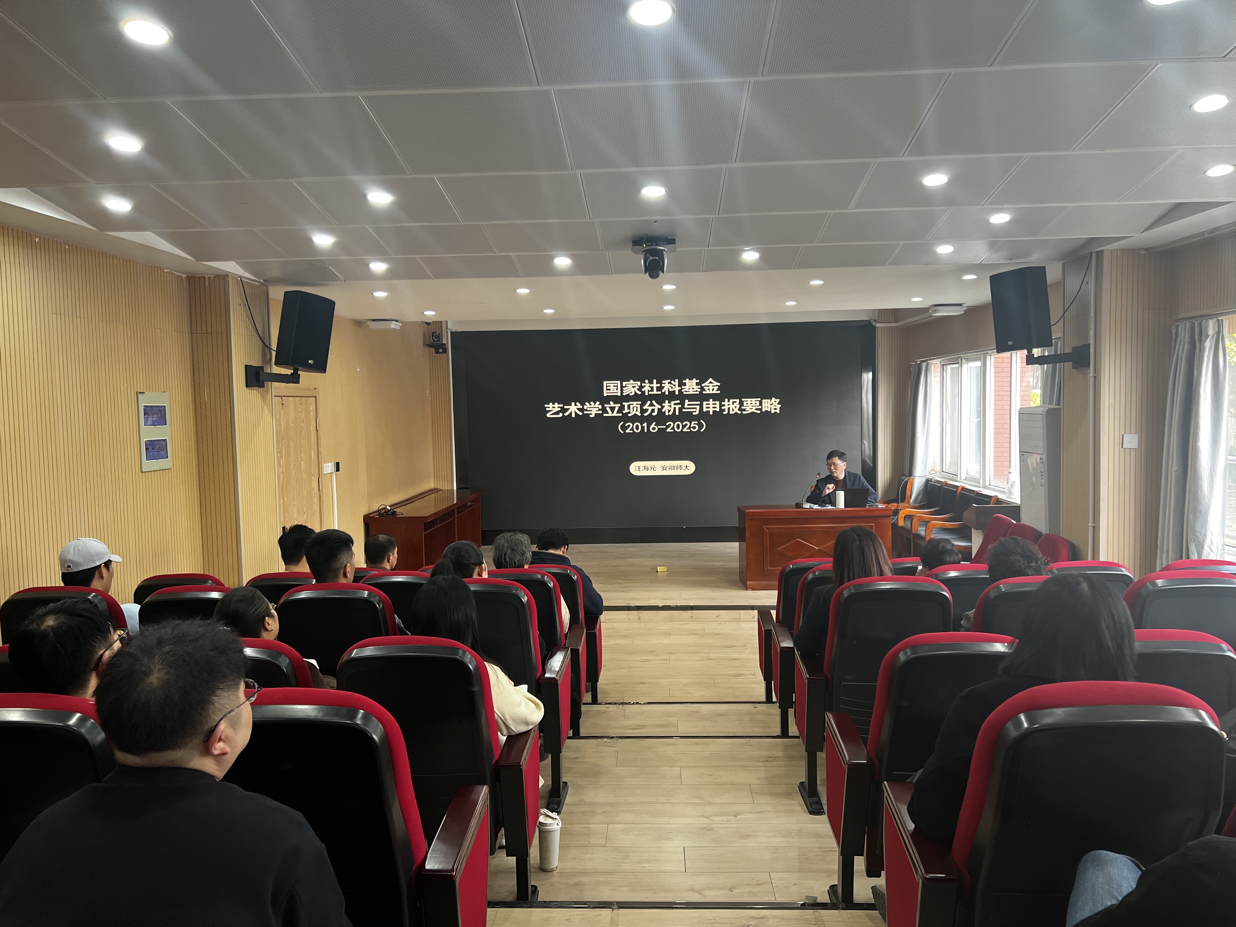 汪海元对国家社科基金艺术学项目的分类体系进行了精准剖析,清晰划分出常规项目与非常规项目两大板块,逐一阐释两类项目的定位差异、申报条件及核心要求。他以时间为轴,回溯国家社科基金艺术学立项的发展历程,梳理不同阶段的政策导向、立项重点及发展趋势,让教师们从历史脉络中把握项目演进逻辑,明晰当前申报所处的时代背景与政策环境。汪海元表示数据是申报的重要支撑,他聚焦近十年国家社科基金艺术学项目申报数据,从申报数量、立项比例、学科分布、地域差异等多维度进行深度分析。在介绍申报实操环节中,他提出“五心申报”理论,结合大量成功与失败案例,展开针对性讲解。整场讲座内容详实、逻辑清晰、案例丰富,既有宏观政策与历史脉络的梳理,又有微观实操与数据支撑的指导,兼具理论高度与实践价值。讲座结束后,大家围绕申报过程中遇到的具体难题踊跃提问,汪海元逐一耐心解答,现场交流氛围热烈。