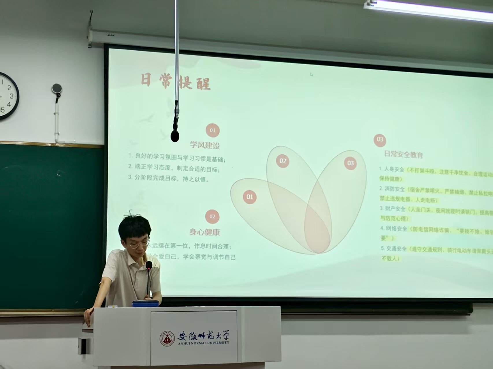 本网讯(音乐学院)9月2日下午,音乐学院2024级本科生在赭山校区教学楼分批召开“开学第一课”主题班会,班会由辅导员张宇豪主持。