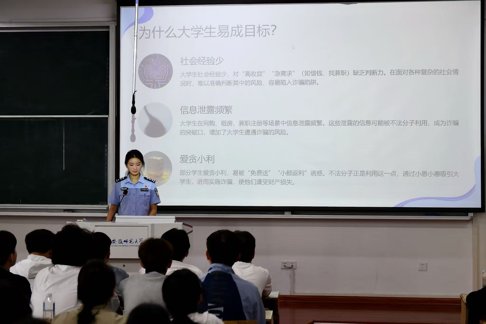 余皓洁从校园诈骗现状、大学生高频诈骗类型、反诈技巧与防范原则、被骗后如何止损、受骗后心理调整五个方面进行宣讲,强调“三不一多”原则:不轻信、不转账、不透露、多核实,共筑平安美好生活。同时,宣传员密切关注学生内心,就学生被骗后心理问题及时提出恢复方案,提出“心理调适三步法”为学生心理健康安全问题作出了积极回应。