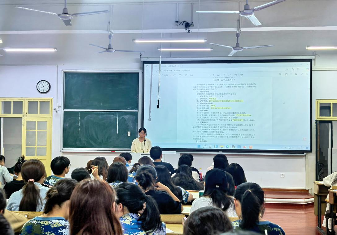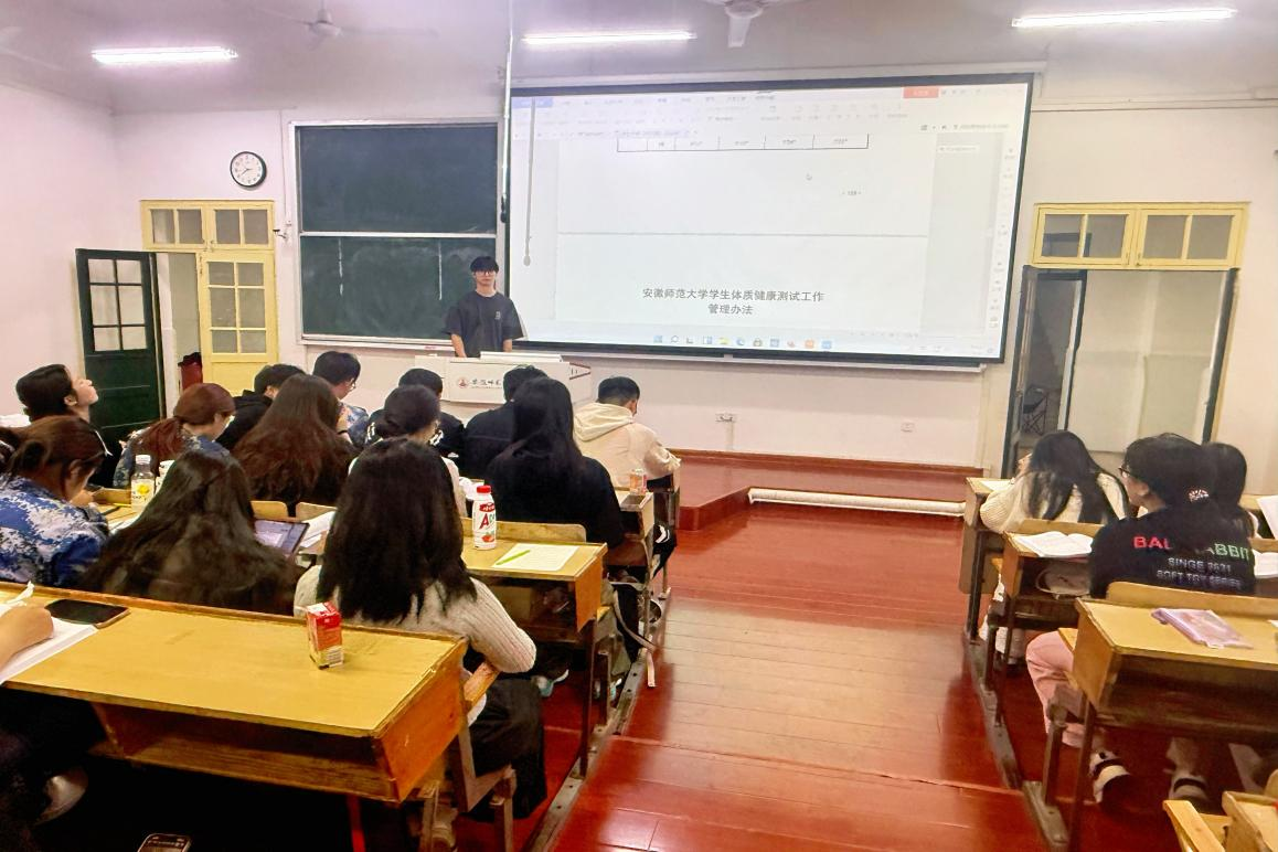 2025级班导生赵梦情为同学们解读《安徽师范大学本科生素质综合测评办法》,打破“唯成绩论”,构建“思想道德+学业水平+实践能力+身心素养”四大评价维度。告诉大家测评内容及评分标准,引起同学们的广泛关注。同时会上还强调在学业完善的基础上,体质健康也尤为重要,解读了《国家学生体质健康标准》,明晰单项指标和权重的具体内容,向同学们展示了体重指数的计算方法,强调“坚持健康第一”的核心思想。