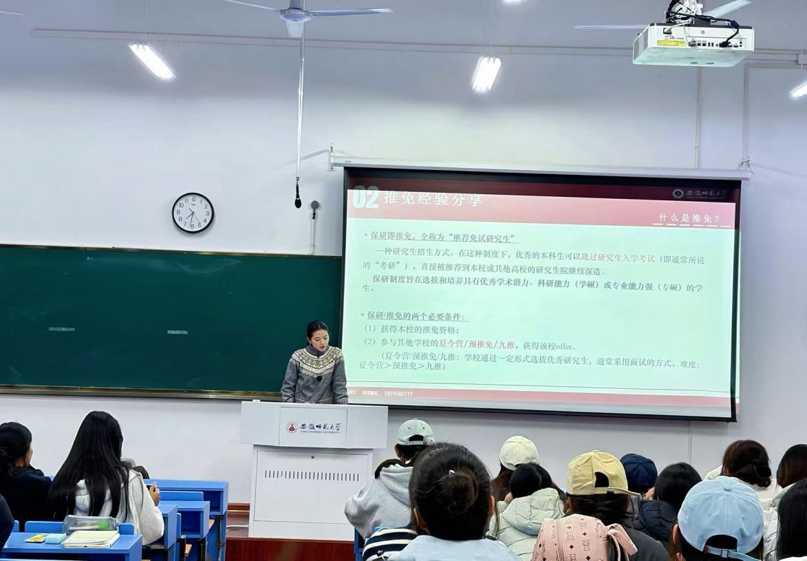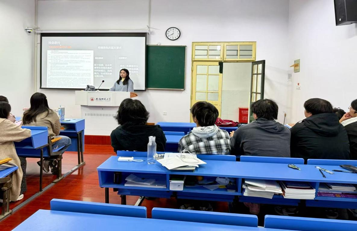 为帮助新生明晰前进方法,找准合适目标,李亚琳学姐围绕“个人经历、学习方法、推免条件及成长建议”展开,会上核心强调“主动”二字:建议新生积极参与学校活动,从中拓宽视野、积累经验,提醒大家多与专业老师沟通,有效解答学术困惑;针对推免条件,学姐明确指出“学分积累是基础”,同时结合自身经历,为有深造意向的新生划定努力重点;同时明确“尝试的重要性”,不要轻易放弃,注重过程。学姐的讲述为新生搭建了优质的经验交流平台,更助力他们以更清晰的目标、更积极的心态开启大学旅程。
