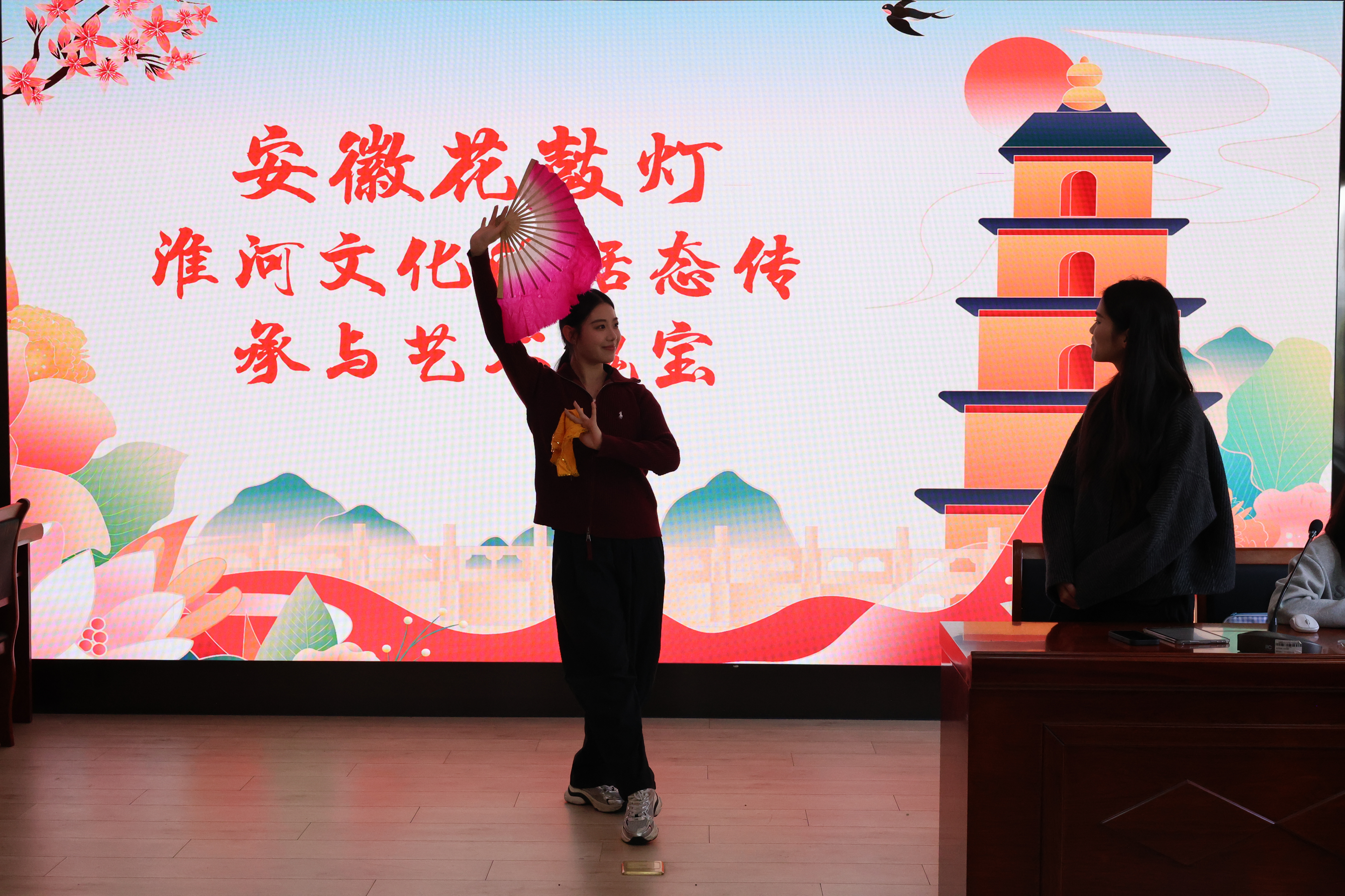 本次实践活动中,张亚楠同学通过对无为鱼灯的艺术调研,将非遗舞蹈艺术与大学生压力纾解相结合,编创了简易版的压力缓解操;马艺珂同学演绎了花⿎灯表演中的“坐地蹦”、“朝天蹬”、“凤摆柳”等代表性动作,并详细阐释了将其运用于大学生日常身体锻炼的可行性与有效性;陆雅婷和胡聪同学把花梆舞中的“敲梆”动作与歌唱开声练习相结合,通过身体律动与发声练习,帮助同学们“敲出烦恼、唱出压力”。