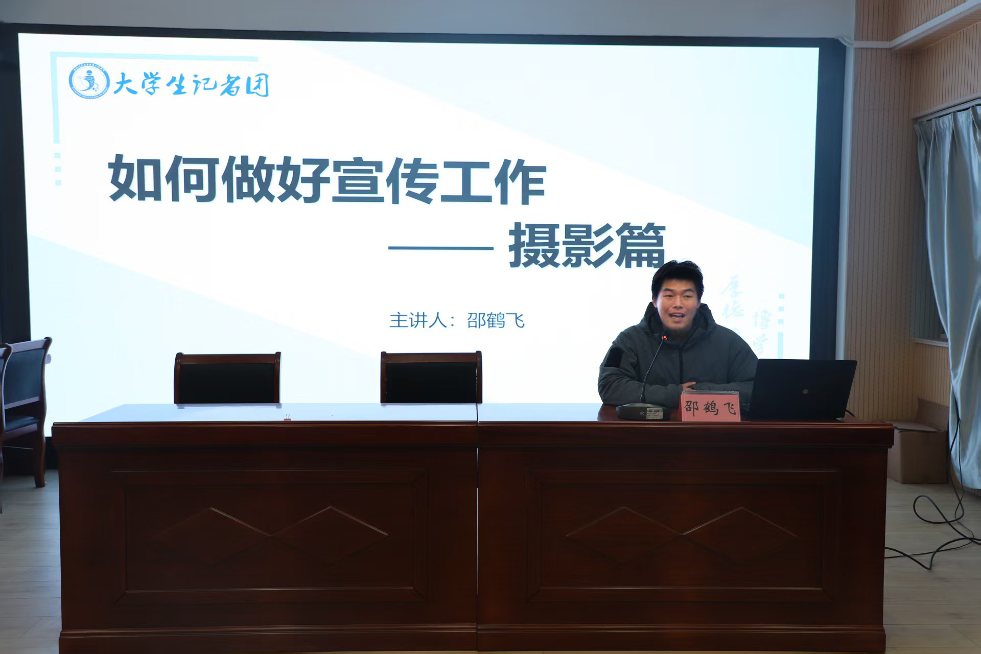 活动现场氛围热烈,同学们早早入场,座无虚席。活动伊始,院团委学生会相关负责人简要介绍了“学生素质能力提升营”系列活动的创办宗旨与整体规划,强调了宣传能力在学生工作与学院发展中的重要作用。来自校大学生记者团的学长邵鹤飞围绕活动主题,系统讲解了宣传策划的基本逻辑、新闻摄影的实用技巧以及视觉构图的核心原则。通过丰富的实例分析与操作演示,帮助同学们理解如何更有效地运用图片与视觉语言进行内容表达与传播。