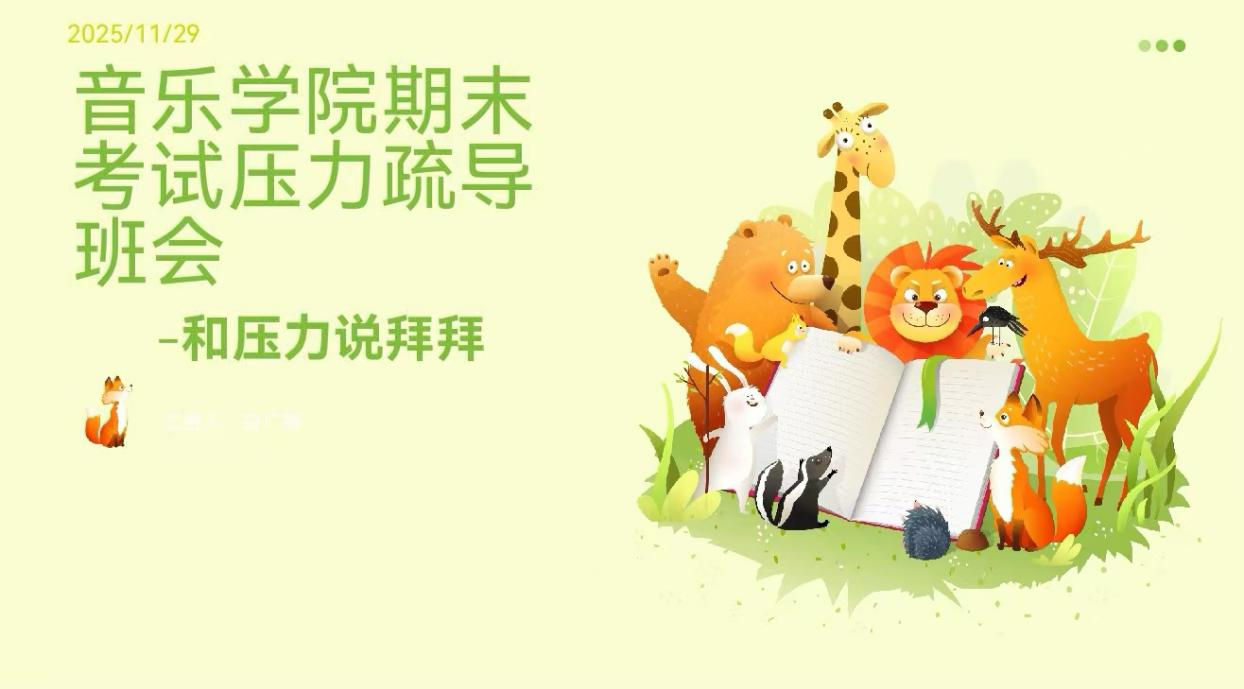 (本网讯 许恺霖 )为筑牢学生心理健康防线,营造良好的校园学习氛围,12月3日至12月10日,由音乐学院心理辅导站主导,组织各班级陆续开展期末考试压力疏导心理健康主题班会,帮助同学们科学应对考试焦虑,以良好心态迎接期末挑战。