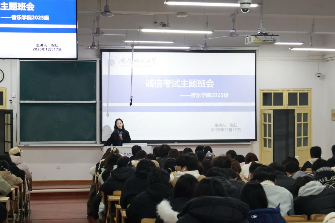 本网讯(25级音乐学 雍肖彤)为强化学生考风考纪意识,筑牢诚信考试思想防线,音乐学院2025级于12月17日在教学楼1401教室召开诚信考试主题班会,班会由辅导员陈虹主讲,25级全体学生参会。