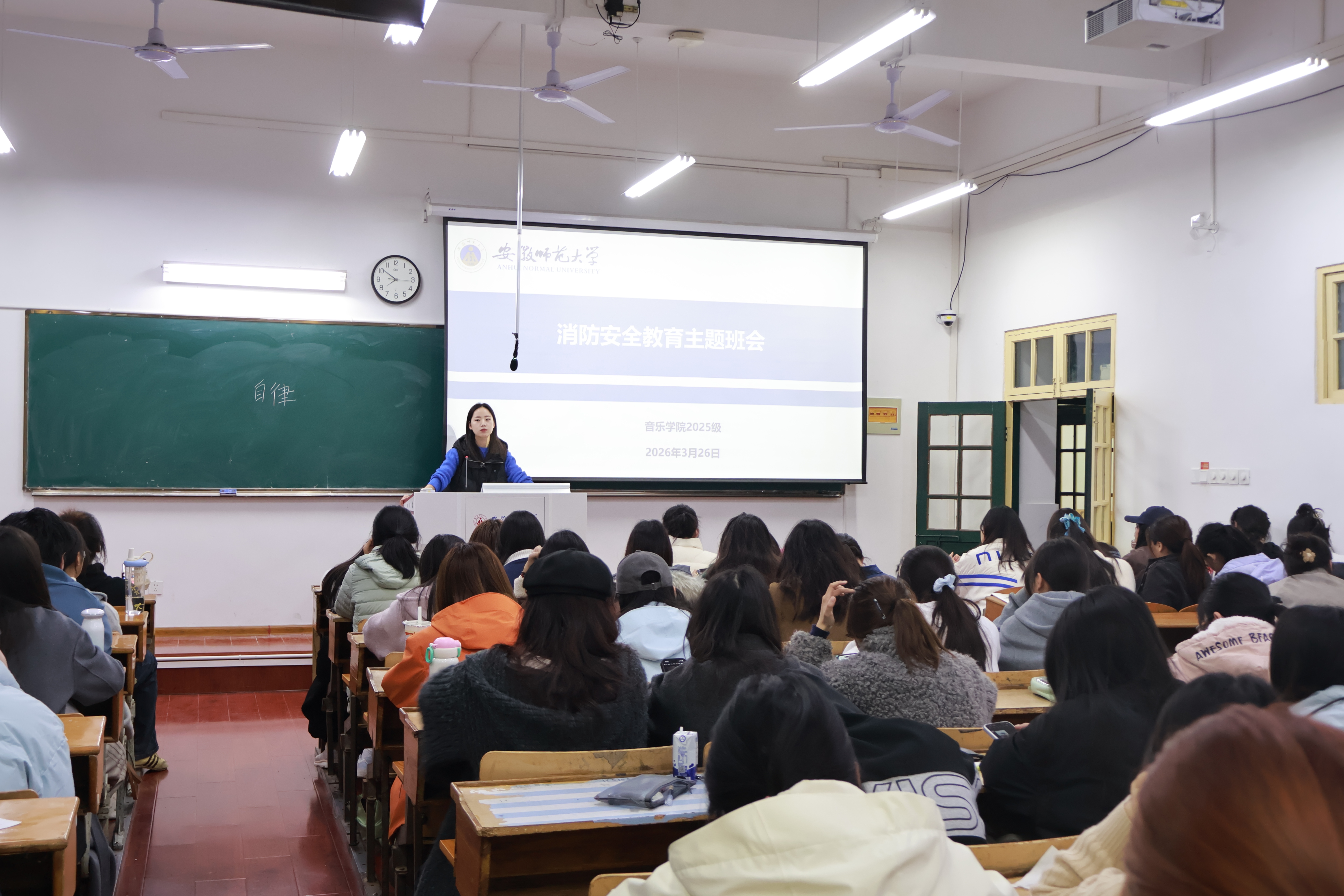 本网讯(25音乐学 刘辰俊飞)为切实加强校园消防安全管理,提升学生安全防范意识与应急处置能力,3月26日晚,音乐学院2025级在教学楼1403教室召开消防安全教育主题班会。班会由辅导员陈虹主持,25级全体同学共同参与学习。