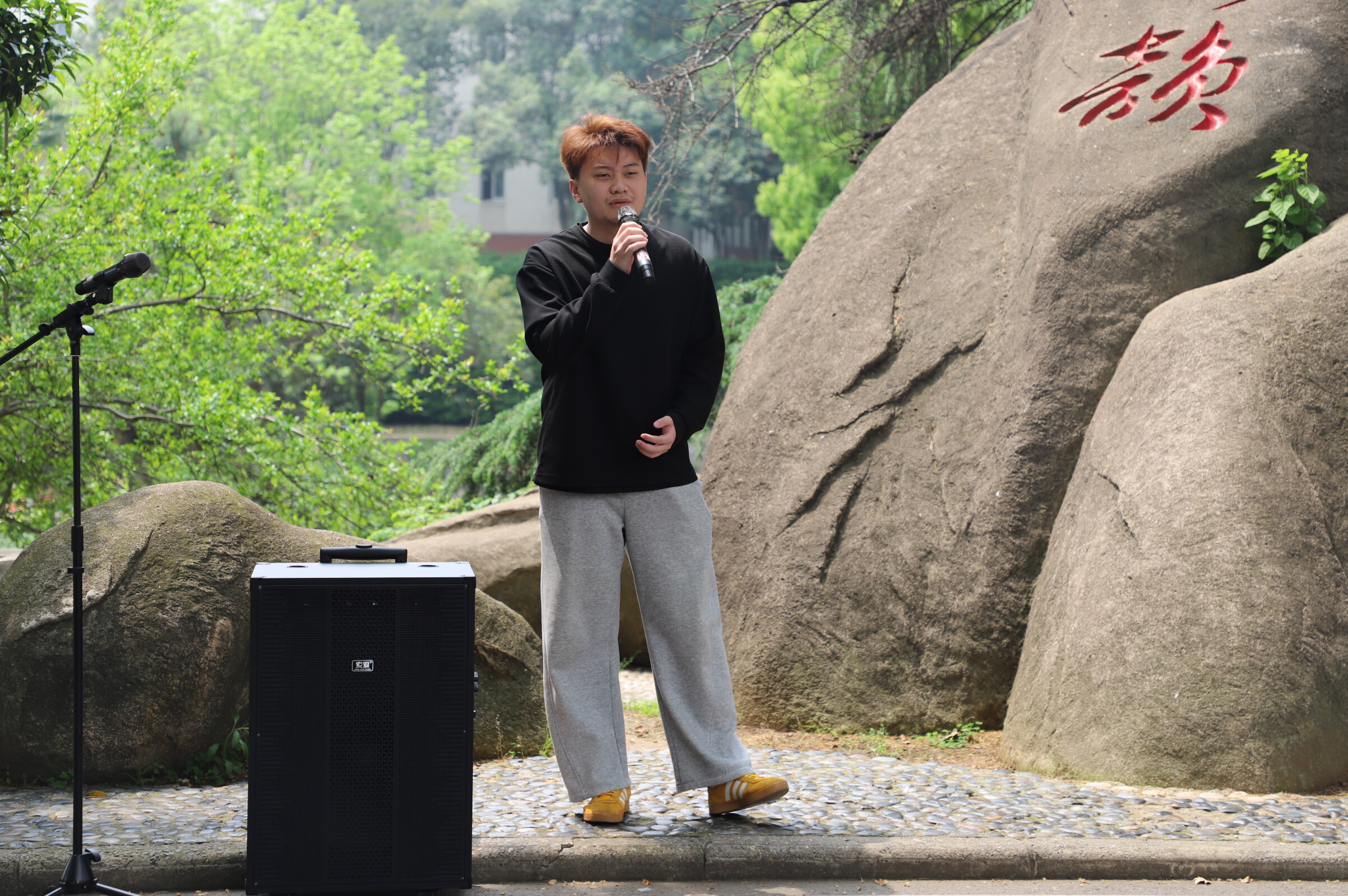 演出现场气氛热烈,曲目选择贴近生活,风格多元。竹笛独奏《看我跃马扬鞭》以明快的节奏率先点燃现场,笛声清脆悠扬,仿佛将听众带入辽阔草原;独唱《稻香》与对唱《我的歌声里》用温暖的声线勾起青春回忆,引发全场轻声合唱;吉他弹唱《反方向的钟》则以独特的改编赋予经典新韵味,节奏轻快又不失深情;独舞《簪花引》身姿曼妙,舞者以古典舞步演绎东方美学,与广场的烟火气形成奇妙碰撞;小提琴独奏《这世界那么多人》旋律舒缓动人,为午间时光增添一抹温柔。同学们用精湛的技艺,让不同风格的音乐在食堂广场上交融共生,吸引了大量师生驻足欣赏。