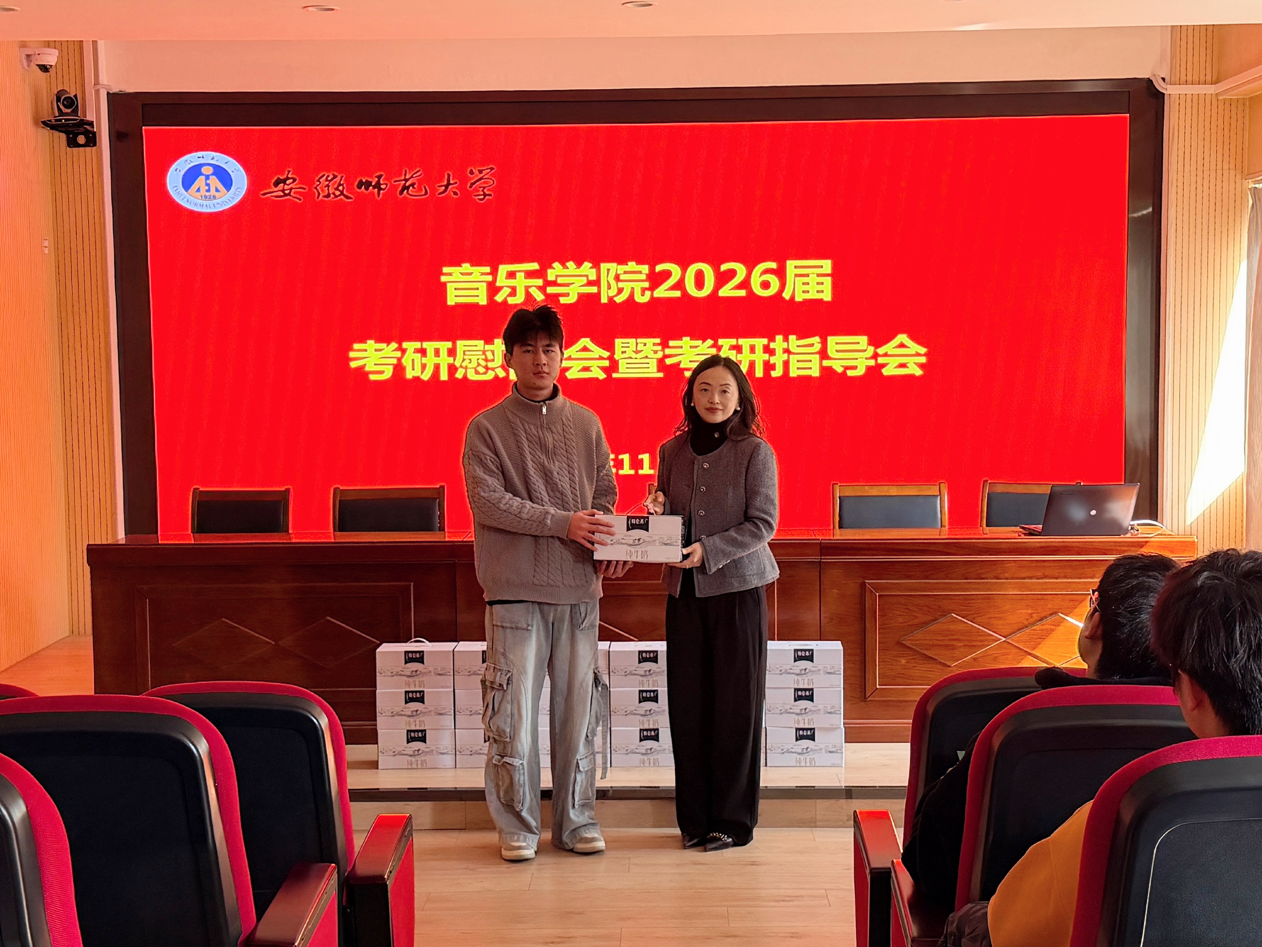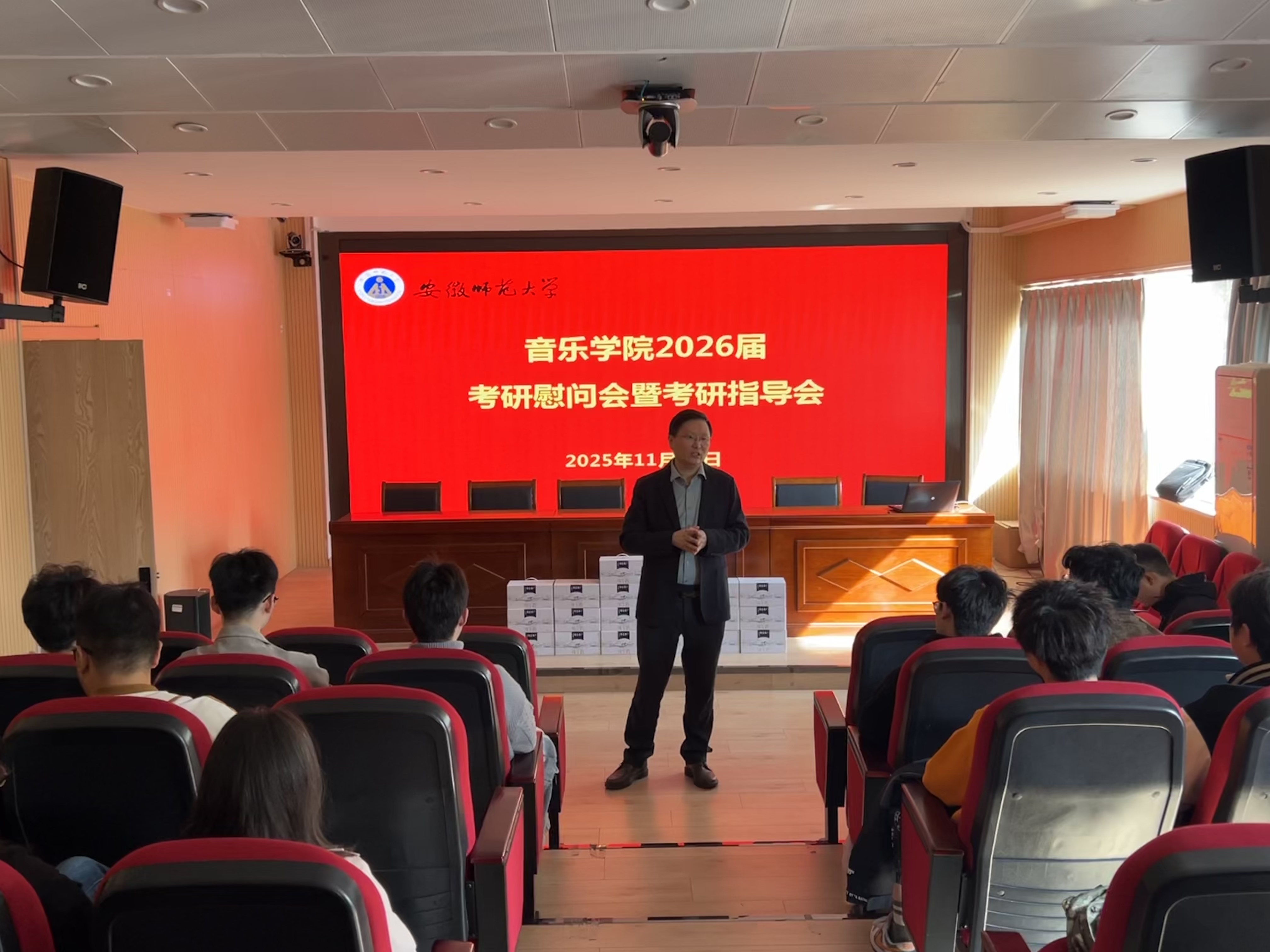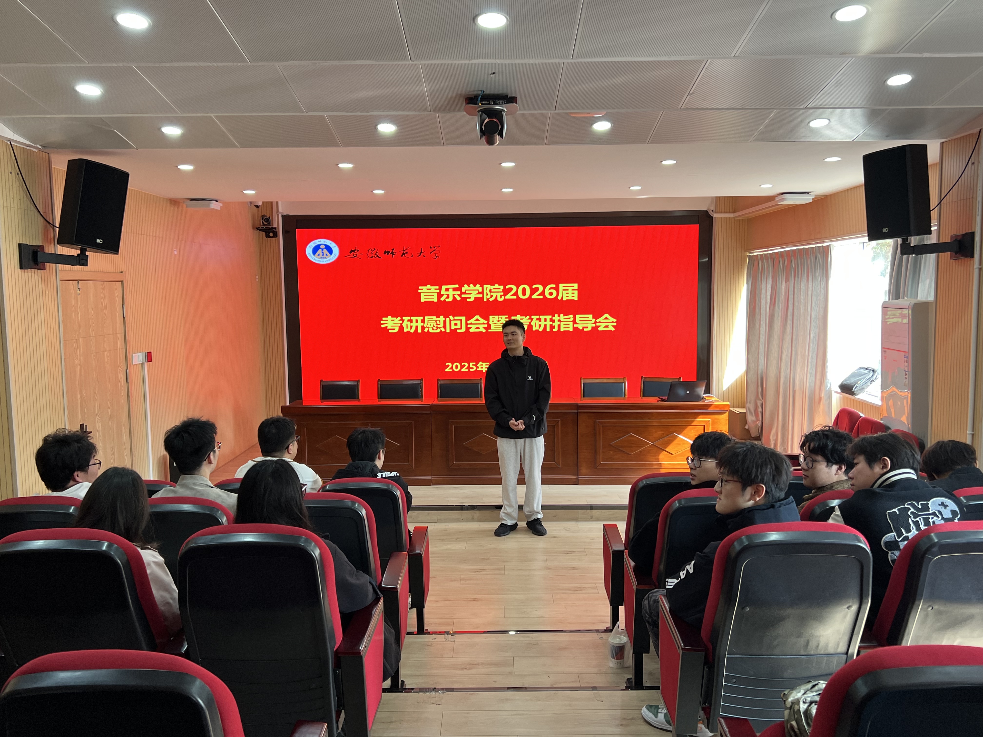 11月13日上午,音乐学院在三楼学术报告厅举行2026届毕业生考研慰问暨考研指导会,院长汪海元、院党委副书记、纪委书记王俊荣、2026届考研学生代表共同参加,会议由2026届毕业班辅导员段传钦主持。