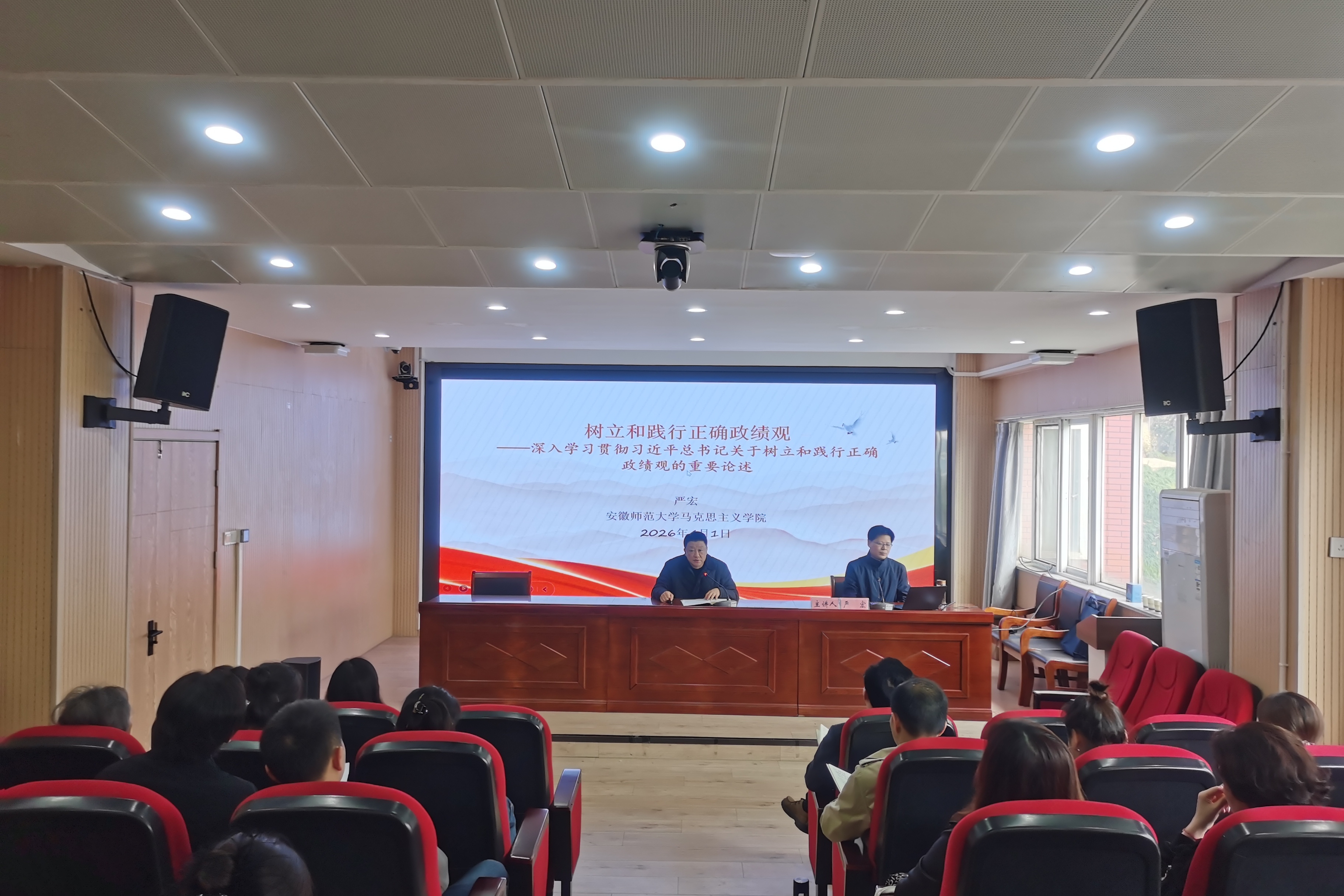 本网讯(党委办公室)近日,音乐学院举行树立和践行正确政绩观学习教育专题辅导报告会,报告会邀请马克思主义学院党委书记严宏教授作专题讲座,全体教职工参加报告会,会议由院党委书记奚泰来主持。