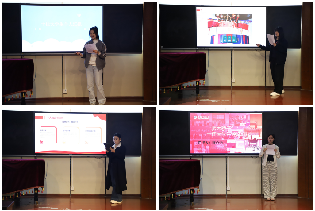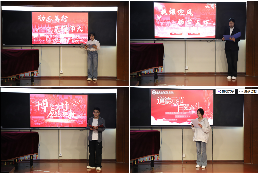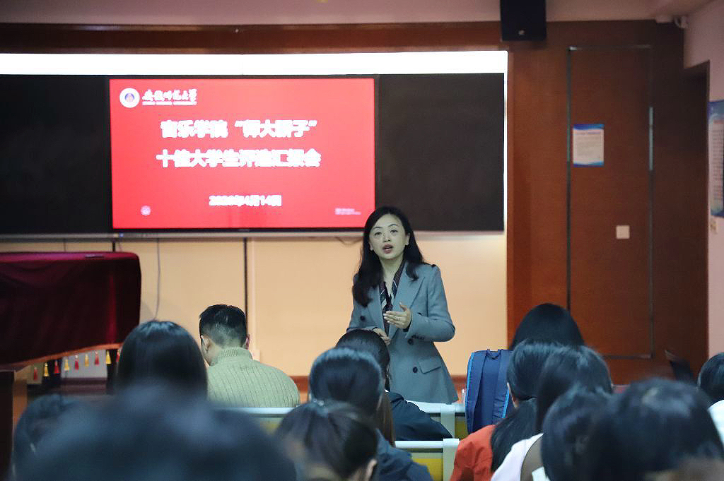 (院团委)4月14日晚,音乐学院举行“师大骄子”十佳大学生院级评选汇会暨学风建设分享会。音乐学院党委副书记、纪委书记王俊荣、舞蹈系教师、2025级班主任张逍和各年级辅导员以及学生代表参加汇报会。汇报会由音乐学院团委书记段传钦主持。