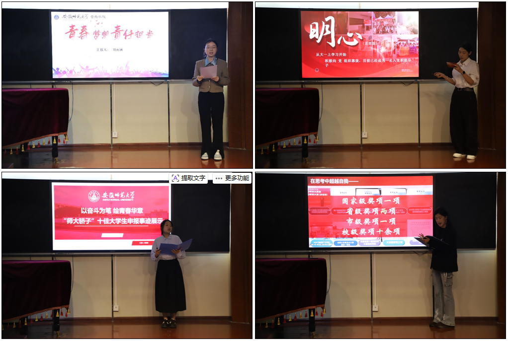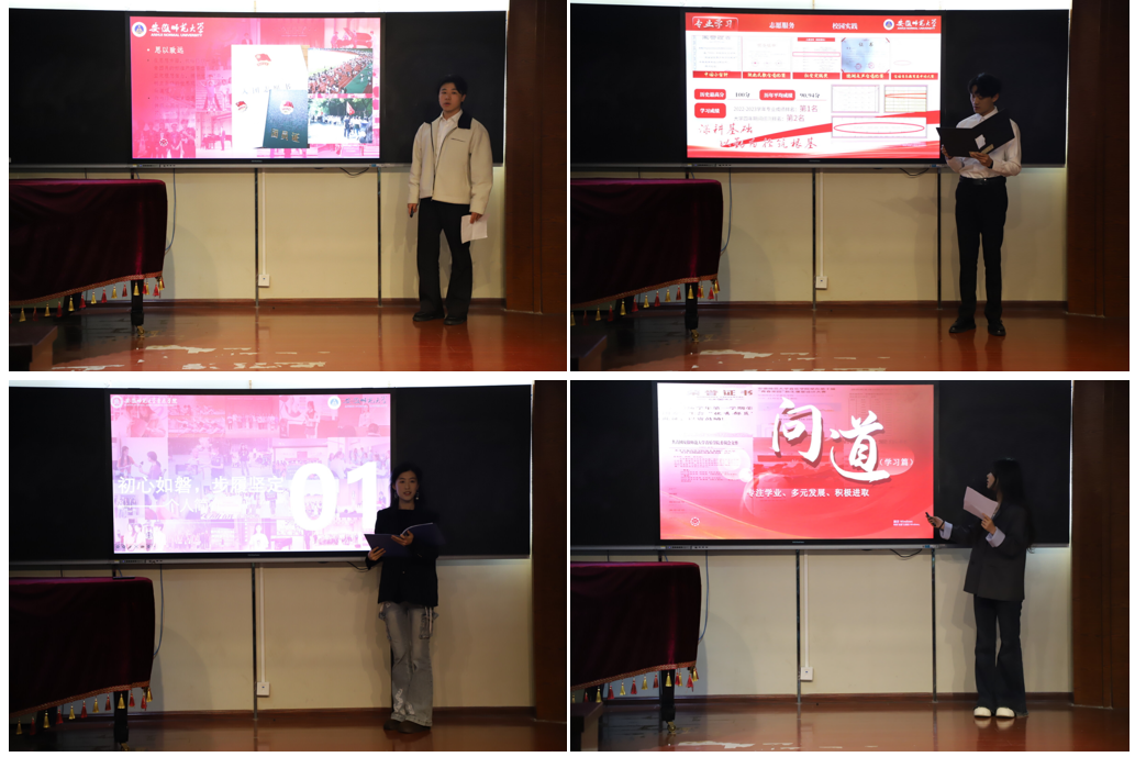 21位汇报人采用PPT演示汇报形式,围绕“道德示范与自强奋斗”“科技创新与自主创业”“社会实践与志愿服务”“文艺创作与体育锻炼”“学风创优与绿色发展”五个类别,结合自身学习、思想、工作、实践等经历与成果进行汇报,展示了音乐学院学子向善向上的精神状态和能吃苦、肯奋斗的拼搏精神与青春风采。