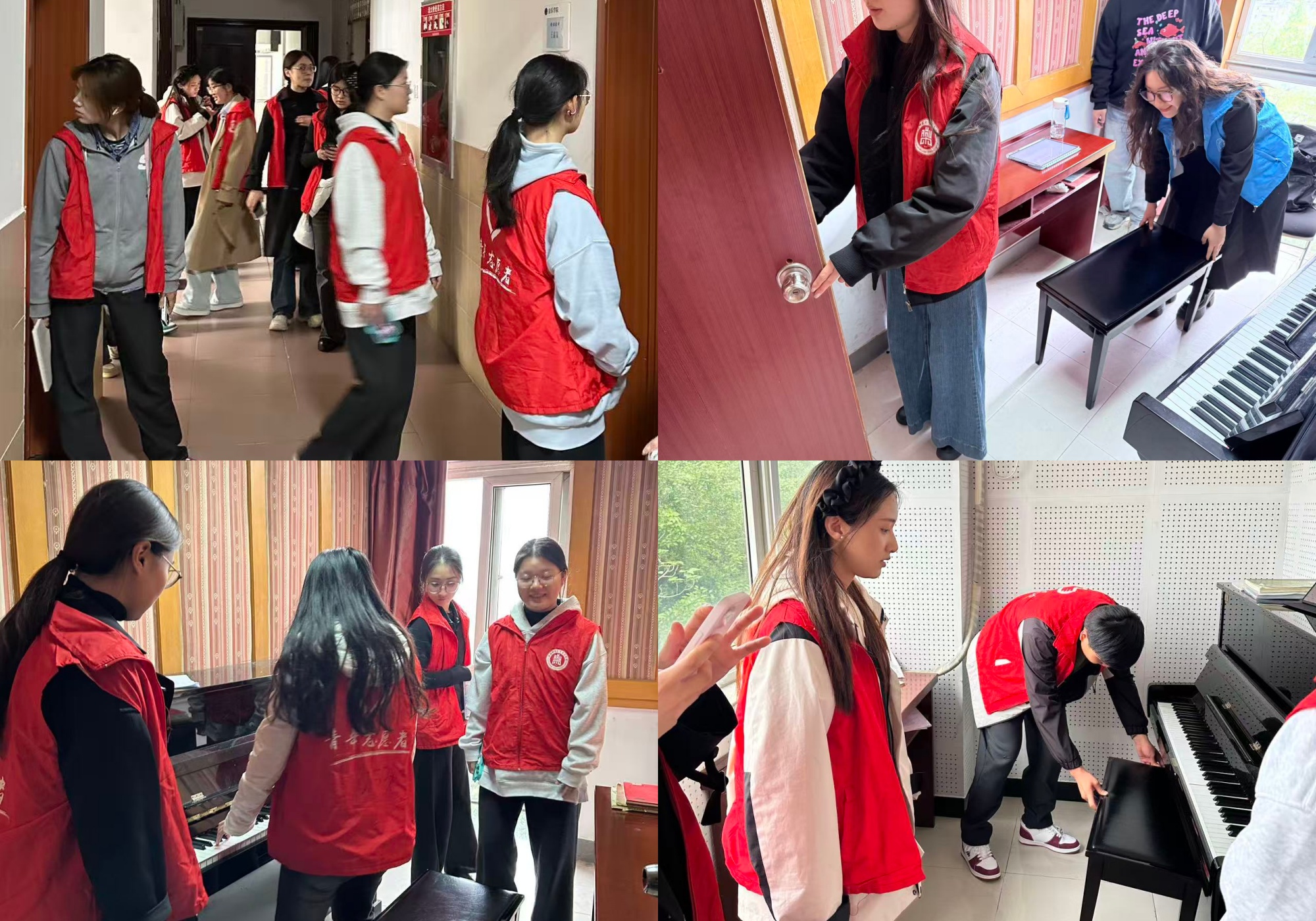 典礼结束后,学院组织全体学员开展文明志愿服务实践活动,推动理论学习与实践锻炼深度融合。志愿者们深入崇艺楼、尚音楼等教学区域,开展琴房设备摸排工作,逐一清点钢琴、琴凳等乐器设施,仔细检查设备状况并汇总信息,为优化琴房管理、服务上琴学生提供精准数据支撑;志愿者们化身交通文明督导员,在学院周边及主要通道协助维持秩序,引导车辆规范停放,耐心劝导不文明行为,有效疏通交通节点,助力校园交通环境优化。