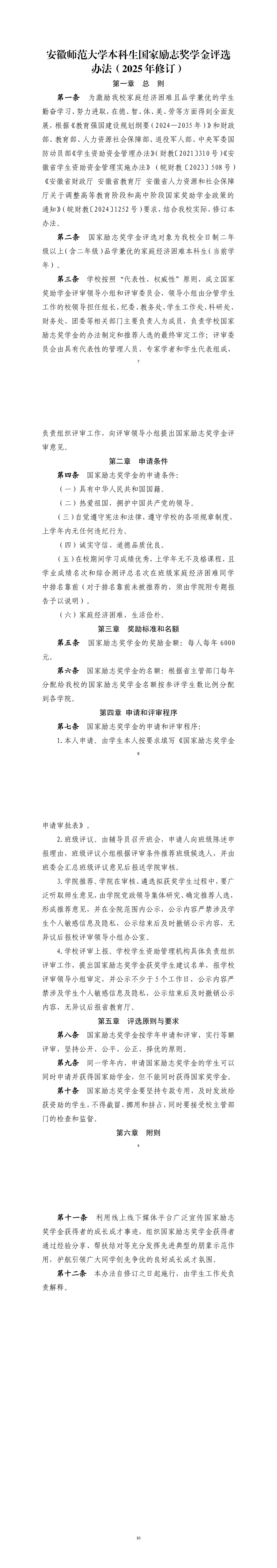 安徽师范大学本科生国家励志奖学金评选办法(2025年修订)