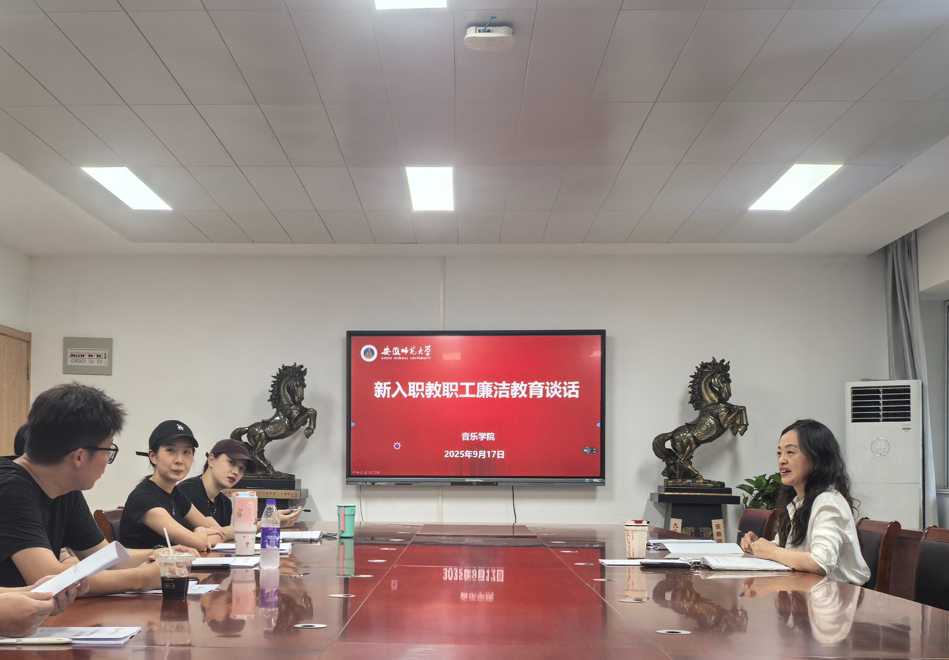 9月17日下午,音乐学院在二楼会议室举行2025年新入职教职工廉洁教育集体谈话会。学院党委副书记、纪委书记王俊荣及新入职的教师参会。会议由王俊荣主持。